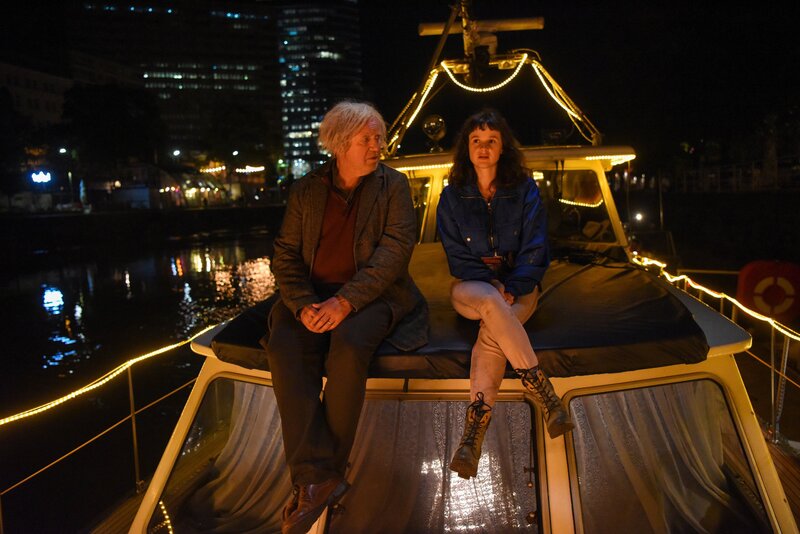 Oskar (Harald Krassnitzer) und Mira (Maresi Riegner) fahren als blinde Passagiere auf einer Yacht durch das nächtliche Wien.Bild: © Hubert Mican / BR, ORF, Cult Film GmbH