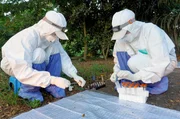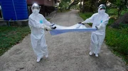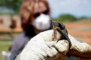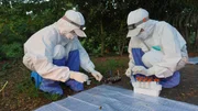 Risikoreiche Arbeit: Die Wissenschaftler können sich bei der Probenentnahme von Körperflüssigkeiten der Fledermäuse mit dem Ebolavirus infizieren.Bild: © Xavier Deleu/Georama TV