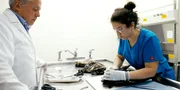 Prof. Guillermo Risatti, Leiter der Abteilung für Pathobiologie und Veterinärwissenschaften an der Universität von Connecticut (USA), untersucht mit einer Kollegin den Kadaver einer Krähe.Bild: © kwanza / Prof. Guillermo Risatti, Leiter der Abteilung für Pathobiologie und Veterinärwissenschaften an der Universität von Connecticut (USA), untersucht mit einer Kollegin den Kadaver einer Krähe.