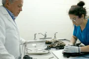 Tierärztin Ariane Düx untersucht den Kadaver des Kopffüßlers, der im Taï-Wald an der Elfenbeinküste gefunden wurde.Bild: © kwanza