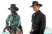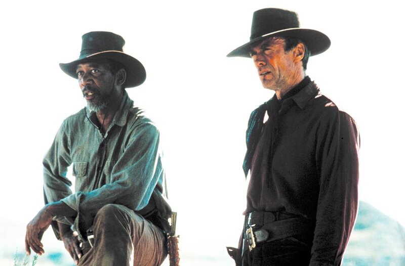 L-R: Billy Munny (Clint Eastwood) and Ned Logan (Morgan Freedman) on horseback facing each other.Bild: © Warner Bros. Discovery