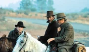 Zu dritt reiten Will (Clint Eastwood, rechts), Ned (Morgan Freeman, Mitte) und Schofield Kid (Jaimz Woolvett, links) aus, um sich das Kopfgeld zu verdienen.Bild: © Warner Bros. Discovery