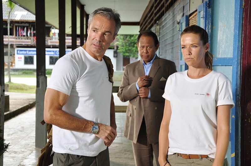 Als Sophie (Alexandra Neldel, r.) zufällig beobachtet, wie sich Dr. Kreusler (Hannes Jaenicke, l.) mit dem Chef der Rebellen (Vithaya Pansrigarn, M.) trifft, läuten bei ihr alle Alarmglocken. Kann sie ihrem Kollegen noch vertrauen?