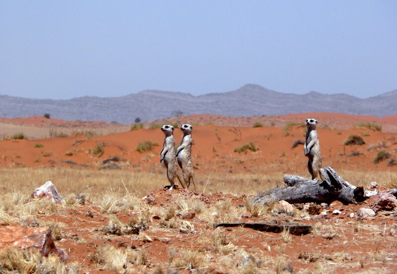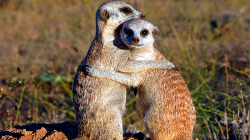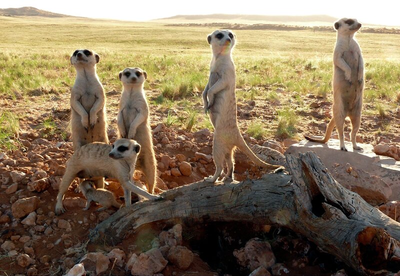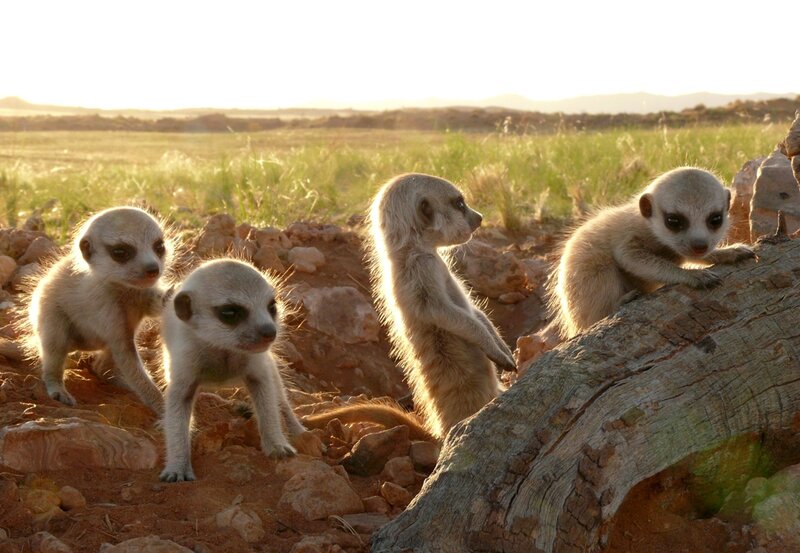Erdmännchen lieben die Sonne. Abends genießen sie die letzten Sonnenstrahlen, bis die kalte Wüsten-Nacht anbricht und sie sich in ihren Erdbau zurückziehen.