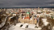 Schnee auch in der Landeshauptstadt, das Neue Rathaus im Sonnenschein, dahinter die City.Bild: © NDR/AZ Media/Holger Steller