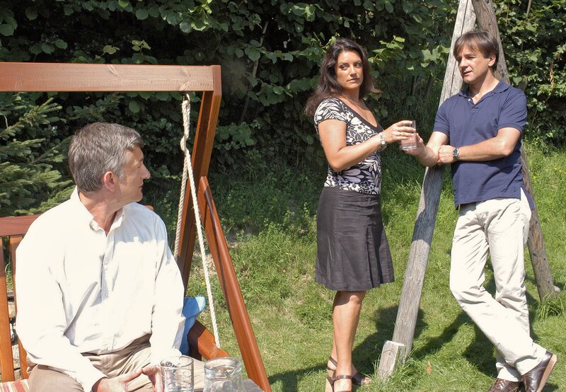 Peter (Peter Davor, Mitte) und sein Freund, der Firmenchef Gabriel (Gabriel Barylli) versuchen, Eva (Christine Neubauer) von weiteren Nachforschungen abzuhalten.Bild: © ARD Degeto/Katrin Knoke