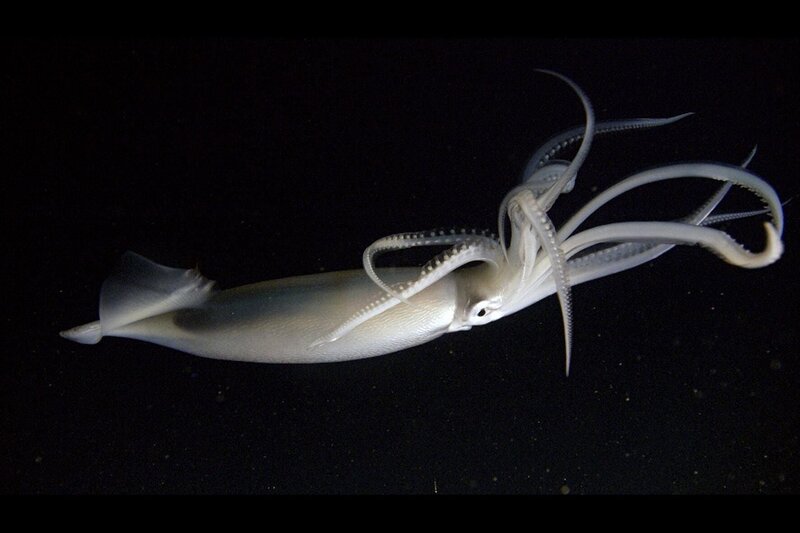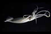 Erdbeer-Kalmare besitzen zwei verschiedene Augen. Ein kleines, um nach unten zu schauen, und ein großes, um nach oben zu blicken. Das große Auge ist darauf spezialisiert, Silhouetten von Beutetieren gegen das verschwindend schwache Restlicht zu erkennen.Bild: © ZDF und NHK