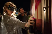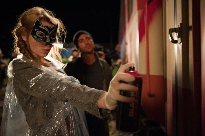 Um Lisis (Karoline Herfurth, l.) Image zu verbessern, lädt Zeki (Elyas M'Barek, r.) ihre Schüler zu einer Graffiti-Sprühaktion an einem Zug ein. Während die Schüler "Fack ju Göhte" sprühen, zeigt Lisi verblüffend viel Talent und gute Nerven ...Bild: © 2013 Constantin Film Verleih / Christoph Assmann Lizenzbild frei