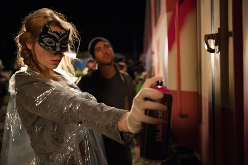 Um Lisis (Karoline Herfurth, l.) Image zu verbessern, lädt Zeki (Elyas M'Barek, r.) ihre Schüler zu einer Graffiti-Sprühaktion an einem Zug ein. Während die Schüler "Fack ju Göhte" sprühen, zeigt Lisi verblüffend viel Talent und gute Nerven ...Bild: © © 2013 Constantin Film Verleih / Christoph Assmann / Christoph Assmann
