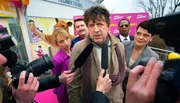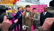 Statt jemanden zu finden, der ihm den museumsreifen Fuzzbuster-Stausauger repariert, gerät Hubert Lotzmann (Jörg Gudzuhn, Mitte) in die Eröffnung des 999. Elektromarktes von Konzernchefin Brenda (Gayle Tufts, re.) mit Marktleiter Schleicher (Peter Trabner, 2. v. li.), Mitarbeiterin Gabi (Christina Große, li.) und Brendas Bodyguard (Eric Lee Johnson, re.).Bild: © ARD Degeto/Dennis Pauls