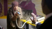 Hubert Lotzmann (Jörg Gudzuhn) nutzt den rauchenden Fuzzbuster als Waffe.Bild: © ARD Degeto/Dennis Pauls