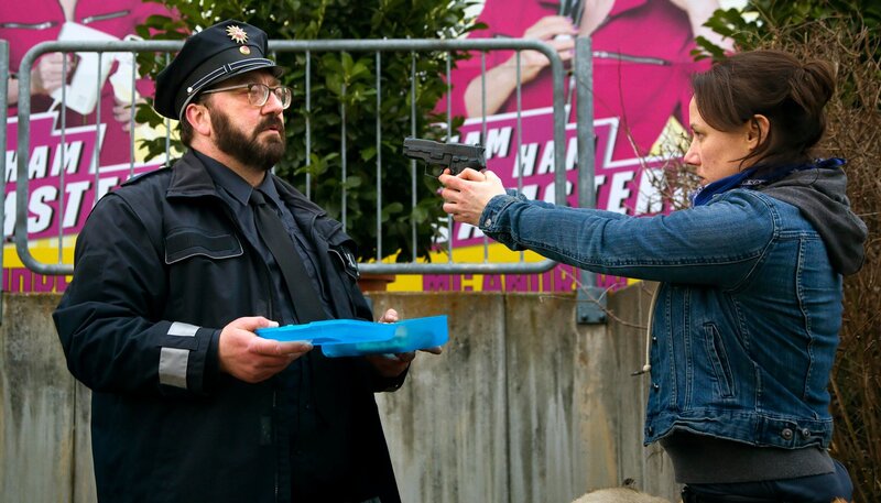 Bille (Eva Löbau) dreht durch und nimmt dem Polizisten Schulze (Heiko Pinkowski) die Waffe ab.Bild: © ARD Degeto/Dennis Pauls