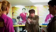 Hubert Lotzmann (Jörg Gudzuhn) im Fokus: Konzernchefin Brenda (Gayle Tufts, re.), Marktleiter Schleicher (Peter Trabner, hinten links), Mitarbeiterin Gabi (Christina Große, li.) und Brendas Bodyguard (Eric Lee Johnson, hinten rechts) stürzen sich auf den vermeintlichen Kunden.Bild: © ARD Degeto/Dennis Pauls