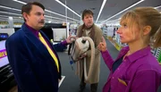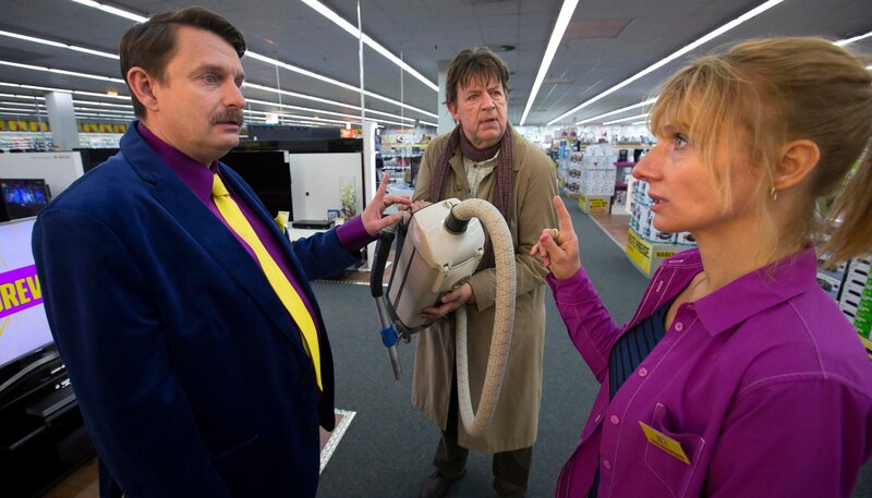 Hubert Lotzmann (Jörg Gudzuhn) will eine Reparatur seines vorsintflutlichen Fuzzbuster. Marktleiter Schleicher (Peter Trabner, li.) und Mitarbeiterin Gabi (Christina Große, re.) versuchen sofort, ihm einen neuen Stausauger andrehen.Bild: © ARD Degeto/Dennis Pauls