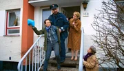 Der Polizist Schulze (Heiko Pinkowski) versucht vergeblich, Bille (Eva Löbau, li.) zu bremsen. Mutter Annemarie (Gisela Schneeberger) und ihre Nachbarin Frau Klapphut (Us Conradi) sind entsetzt.Bild: © ARD Degeto/Dennis Pauls