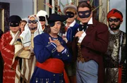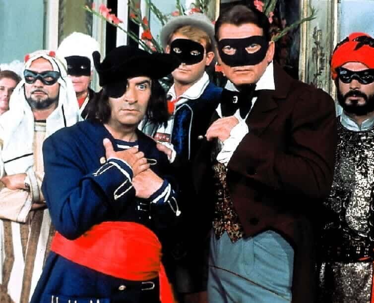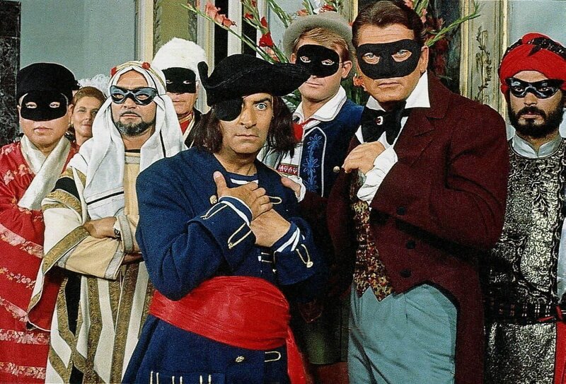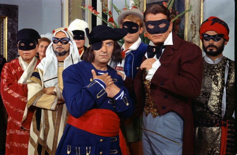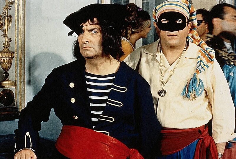 Um Fantomas zu fangen, versuchen sich auch Kommissar Juve (Louis de Funès, l.) und der Journalist Fandor (Jean Marais) in der Kunst der Verkleidung - auf einem Maskenball in Rom.Bild: © ServusTV