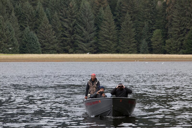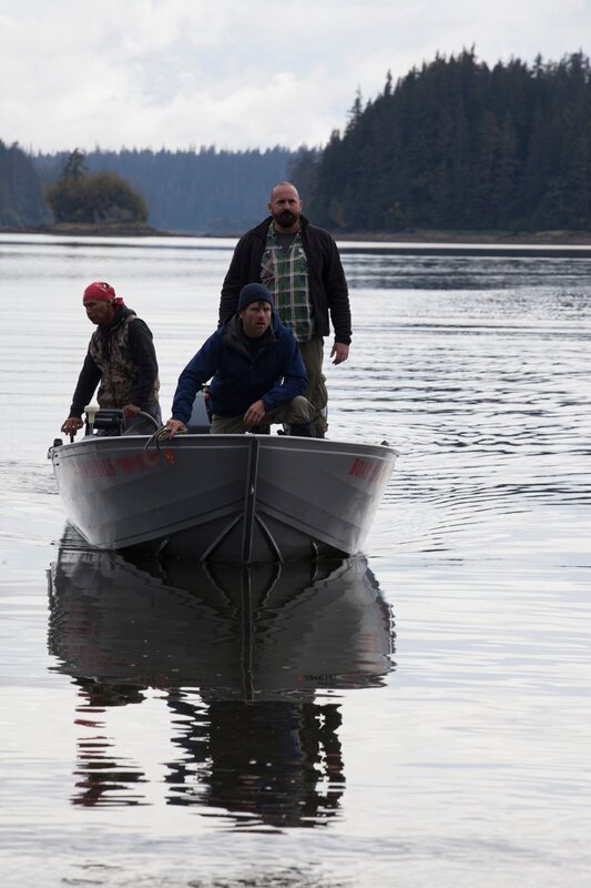 Bradley Trevor Greive, Jonathan Legg, and Alvin Johnson Sr. scout for bears from their boat.Bild: © Animal Planet / Discovery Communications