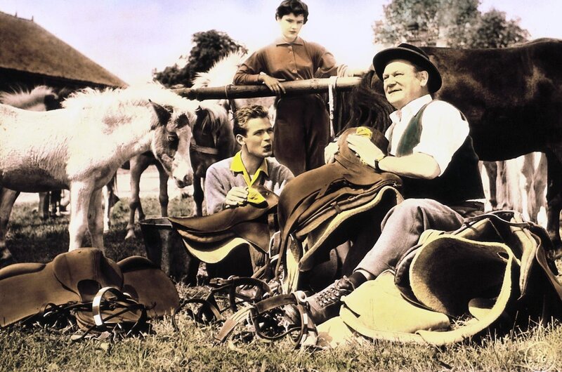 2. Die Ponys sind die Attraktion auf Immenhof, aber nicht nur für die Gäste, sondern auch für Dick (Angelika Meissner), ihren Freund Ralf (Raidar Müller) und den Portier Hein Daddel (Josef Sieber, re.).Bild: © ZDF und Taurus - Film, München
