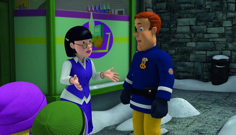 Frau Chen erklärt Sam, dass der Weihnachtsbaum für Pontypandy nicht geliefert wurde.Bild: © KiKA/Prism Art & Design Limited