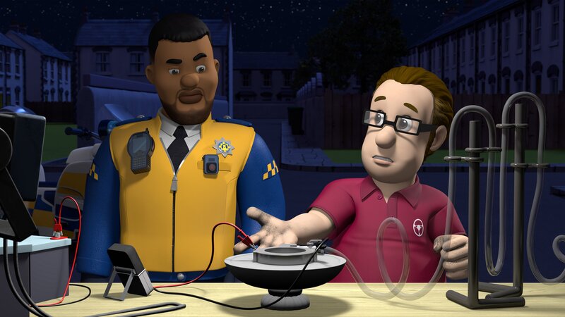 Die Polizei hat ihren ersten Einsatz: Joe Sparkes vermisst seine neueste Erfindung. Kann Polizeimeister Malcolm die verschwundene Superbatterie finden?Bild: © ZDF/Zia Ziarno