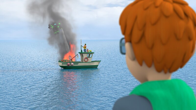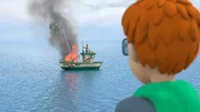Nach dem Verschwinden von Joes Superbatterie passieren komische Dinge in Pontypandy. Norman-Man beobachtet, wie der "fliegenden Mann" Charlies Fischerboot löscht.Bild: © ZDF/Zia Ziarno