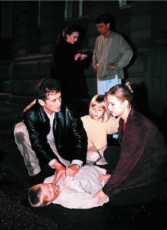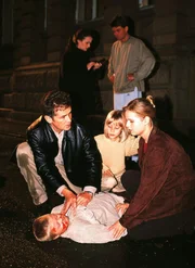 Peter (Timothy Peach), Maria (Bojana Golenac, re.) und Sophie (Sina Tkotsch, Mi.) sind geschockt: Florian (Dennis Bartelniewöhner) wurde von einem Auto angefahren ...Bild: © RTL Passion