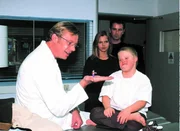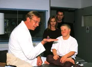 Dr. Clemens Schadewaldt (Neithardt Riedel, li.) untersucht für seine Freunde Peter (Timothy Peach) und Maria (Bojana Golenac) den kleinen Florian (Dennis Bartelniewöhner, re.).Bild: © RTL Passion