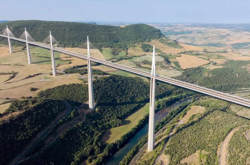 Der Viadukt von Millau ist die längste Schrägseilbrücke der Welt – und mit einer maximalen Brückenpfeiler-Höhe von 343 Metern die größte Brücke der Welt.
