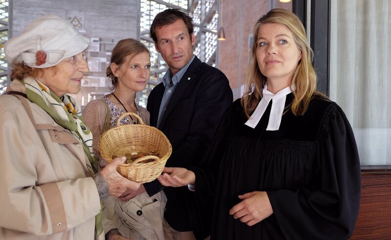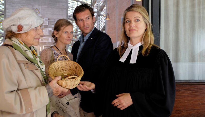 Frau Hartinger- Monika John; Petra Keller- Jasmin Rischar; Frank Keller- Siegfried Terpoorten; Rieke Schmidt- Birge Schade; Spenden wurden gesammelt Pfarrerin Rieke Schmidt (Birge Schade, re.) kümmert sich um alle in ihrer Gemeinde. Hier mit Mitarbeiterin Petra Keller (Jasmin Rischar) und deren Mann Frank (Siegfried Terpoorten) sowie der Rentnerin Frau Hartinger (Monika John, li.).