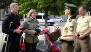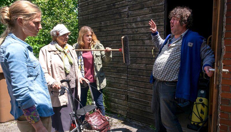 Überraschung für Pfarrerin Rieke (Birge Schade, 2. v. re.), Rentnerin Frau Hartinger (Monika John) und Gemeindehelferin Petra Keller (Jasmin Rischar, li.): Der Obdachlose Heiner Stadler(Rainer Piwek) hat sich im Schuppen einquartiert.