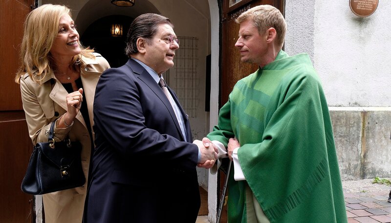 Priester Toni Seidl (Martin Gruber, re.) fängt in der katholischen Gemeinde neu an und versteht sich auf Anhieb gut mit dem mächtigen Pfarrgemeinderat Gregor Häusler (Erwin Steinhauer) und dessen Frau (Sabine Bach).