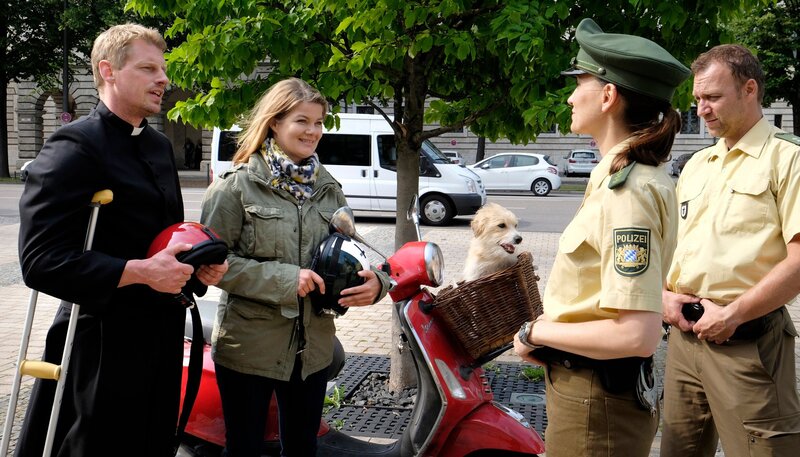 Mit den weltlichen Regeln nehmen es „Frau Pfarrer“ Rieke Schmidt (Birge Schade, 2. v. li.) und „Herr Priester“ Toni Seidl (Martin Gruber, li.) nicht immer hundertprozentig genau und werden nun von den beiden Polizisten ( Polizistin- Kathrin Anna Stahl und Lörg Gennun) angehalten.