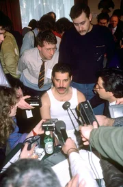 Freddie Mercury 1984, umgeben von Reportern: Er liebte die Promiskuität aber hasste Interviews. Er war „The Great Pretender“: ein fast schüchterner Mann, der auf der Bühne zum Orkan wurde.Bild: © Mike Maloney / Rex Features / Mercury Studios Ltd
