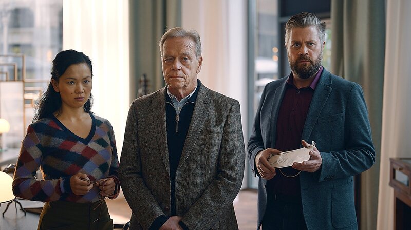 Chinh (Yvonne Yung Hee Bormann, hinten li.), Elmar (Jürgen Heinrich, hinten Mitte) und Roland (Andreas Birkner) staunen nicht schlecht: Der unsympathische Frank versteht sich blendend mit Hund Yoda.