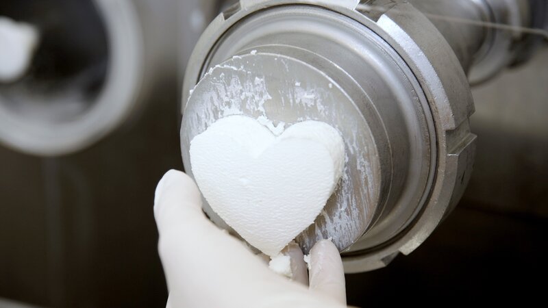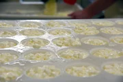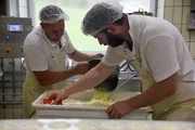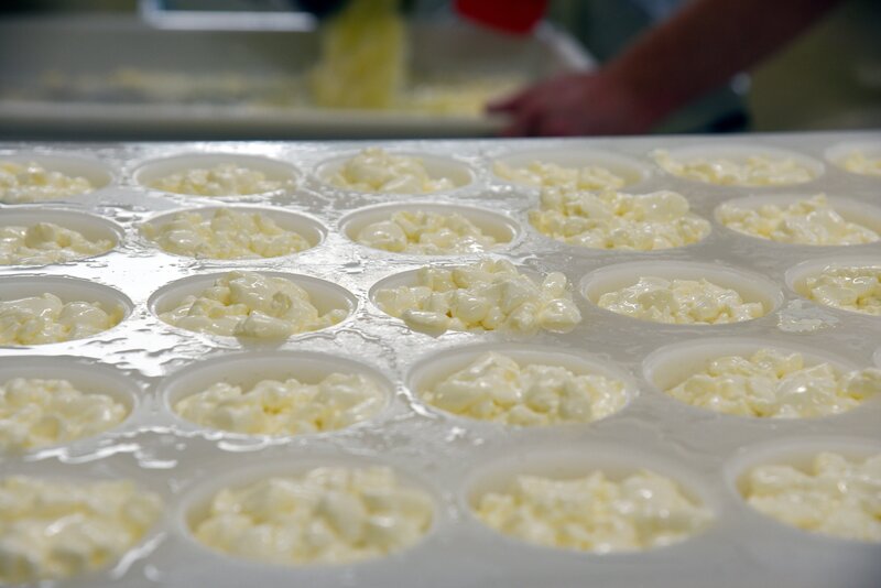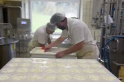 Produktion des Herzerlkäses: Die Frischkäsemasse wird aus der Form gepresst.Bild: © ORF/Produktion West/Gerhard Mader