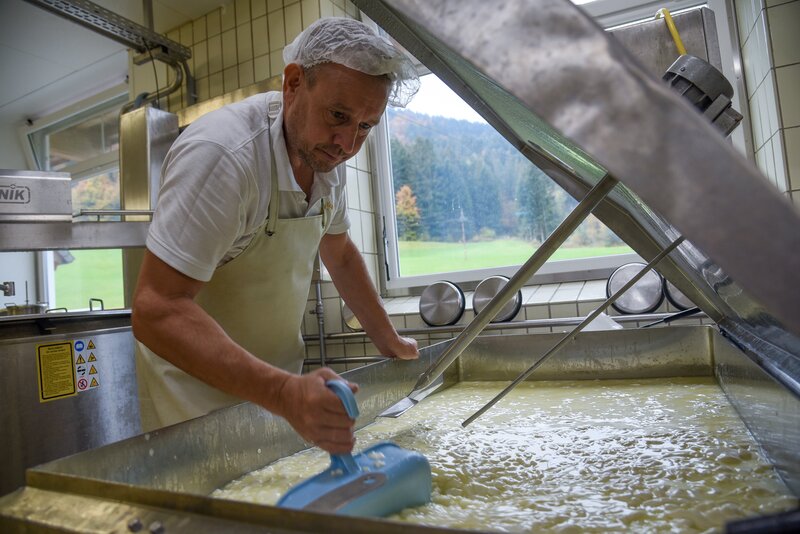 Franz Hollaus bei der Frischkäseproduktion in der Sennerei Hatzenstedt (Tirol).Bild: © ORF/Produktion West/Gerhard Mader