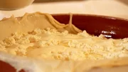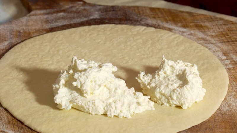 Die Zubereitung von Kvasenica, einer Germteigflade, die mit ungesüßtem Topfen belegt und mit Sauerrahm bestrichen gebacken wird.Bild: © ORF/Produktion West/Gerhard Mader