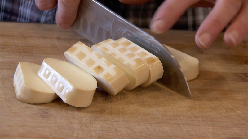 Geräucherter Frischkäse wird in Scheiben geschnitten.Bild: © ORF/Produktion West/Gerhard Mader