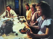 Mitten ins gemütliche Essen im Königshaus springt der Frosch auf den Tisch, um von Prinzessin Henriette (Jan Mattukat, re) ihr Versprechen einzufordern (li Peter Sodann als König). Henriette ist entsetzt.Bild: © MDR/Progress Film-Verleih