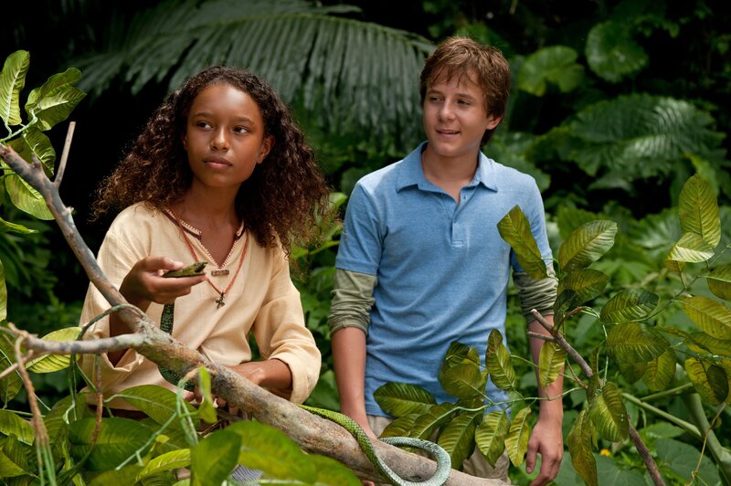 Joe (Davina Weber, l.) und Dick (Justus Schlingensiepen, r.) durchstreifen den Urwald auf der Suche nach einem versteckten Piratenschatz. Dort müssen sie sich vor den gefährlichen Giftschlangen in Acht nehmen.