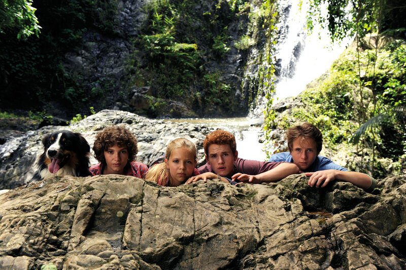 Um ihre einheimische Freundin Joe (Davina Weber, l.) davor zu bewahren, von ihrer Insel vertrieben zu werden, unterbrechen die fünf Freunde Dick (Justus Schlingensiepen, r.), Julian, Anne, George und Hund Timmy ihren Urlaub und suchen einen verschollenen Piratenschatz ...