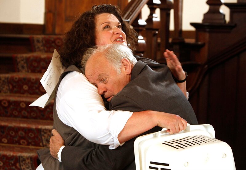 Chauffeur Justus (Peter Franke) fällt der Haushälterin Hilde (Sabine Orleans) vor Freude in die Arme, als er von seiner bestandenen Fahrprüfung erfährt.Bild: © ARD Degeto/Frank Dicks
