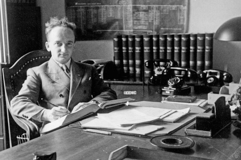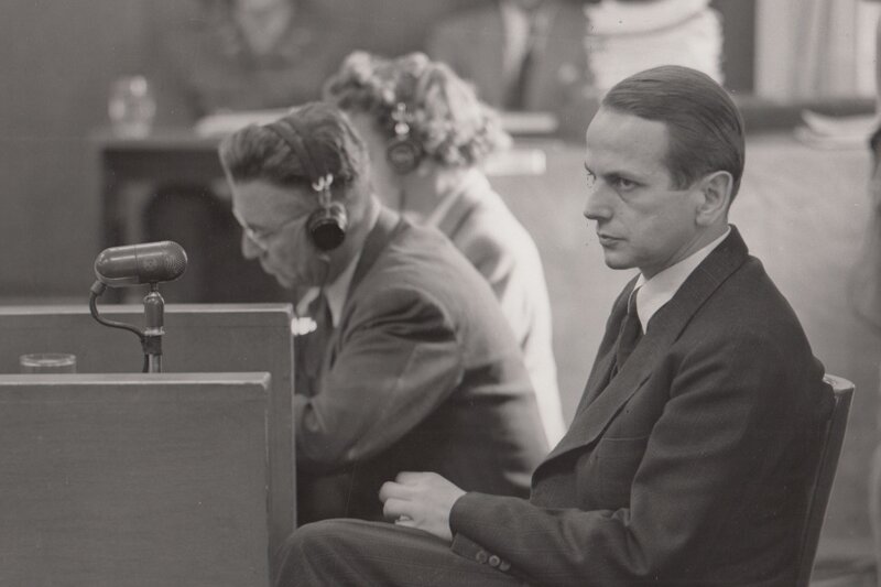 Otto Ohlendorf (r.), ehemaliger Leiter der sogenannten Einsatzgruppe D, steht im Mittelpunkt des sogenannten Einsatzgruppenprozesses. Er befehligte 600 Männer, die in einem Jahr 90 000 Menschen ermordeten.