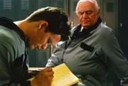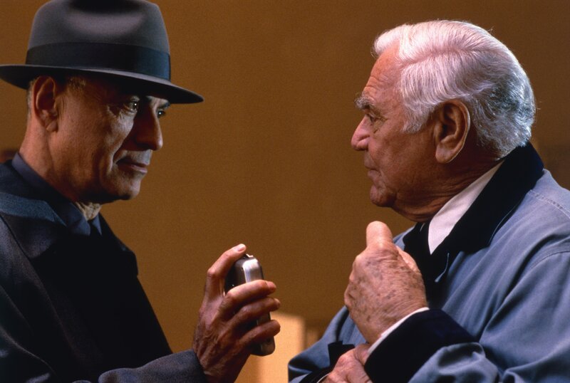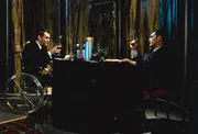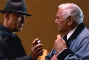 Direktor Josef wird von den Detektiven Anton und Hugo verhört, v.li.: Loren Dean als Anton, Gore Vidal als Josef, Alan Arkin als Hugo.Bild: © ZDF
