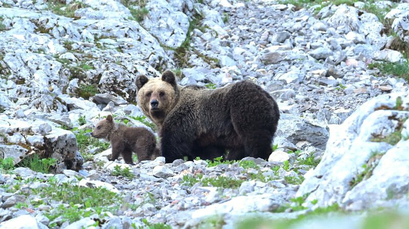 Braunbärin mit ihrem Jungen in einer felsigen, bergigen Umgebung.Bild: © SWR/BR/Beetz Brothers Film Production/Horst Eberhöfer