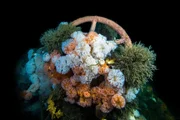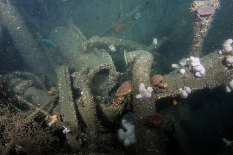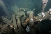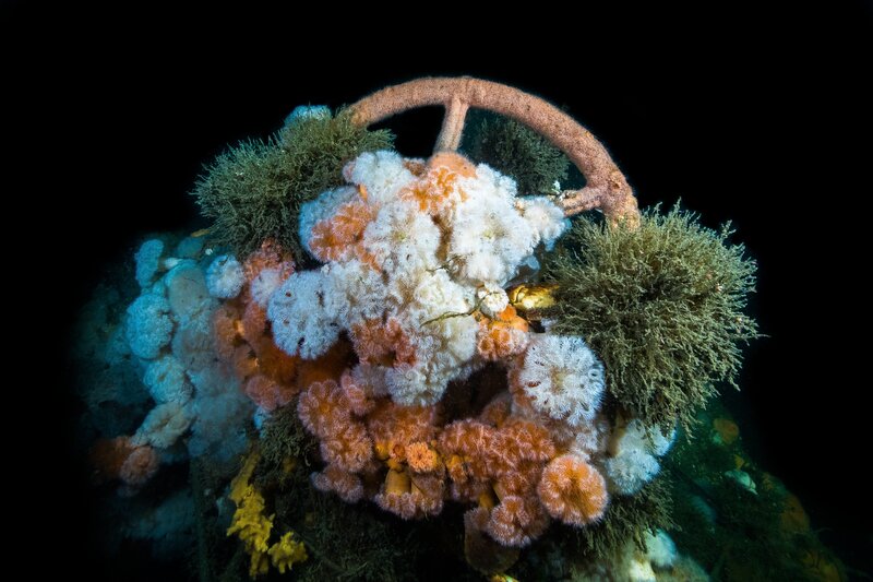 Das Torpedoboot V 187 ist eines der vier deutsche Kriegsschiffe, die im ersten Weltkrieg vor Helgoland. im Gefecht gegen die britische Marine sanken. Dieser Teil der Kesselanlage des Wracks ist von Blumentieren überwuchert.
