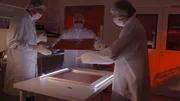 Die Forscher setzen das Myonen-Teleskop zusammen und setzen dazu eine Fotoplatte ein.Bild: © Quentin Esperse / ZDF