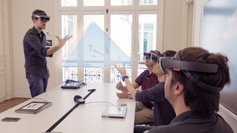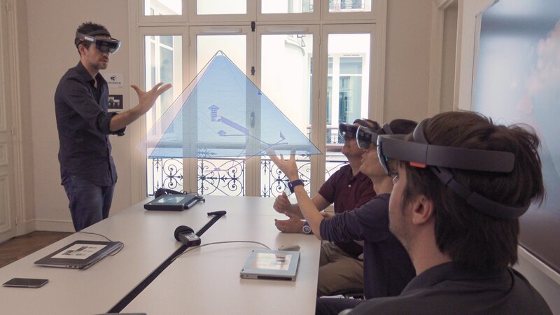 Die Forscher präsentieren ihre Ergebnisse mit einem Modell der Pyramide in erweiterter Realität und tragen dazu entsprechende Brillen.Bild: © ZDF und Quentin Esperse
