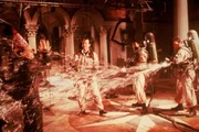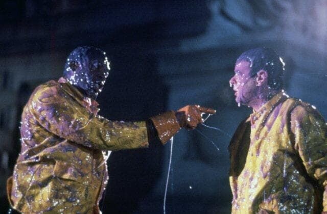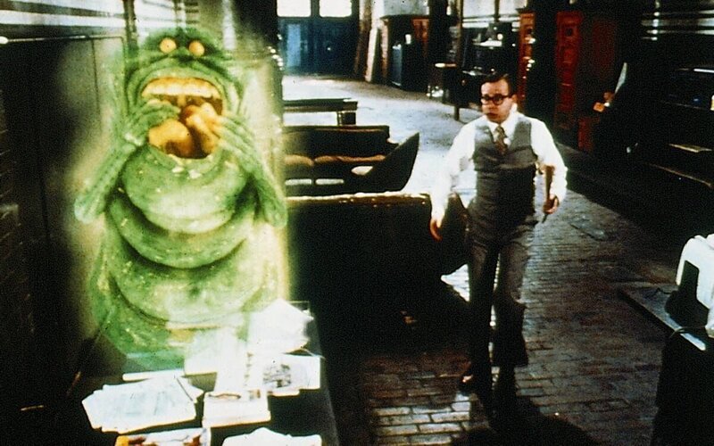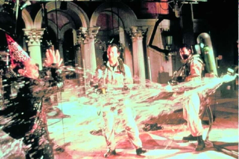 Raymond Stantz (Dan Aykroyd, r.), Egon Spengler (Harold Ramis, l.) und Winston Zeddemore (Ernie Hudson, M.) werden von einem Geist aus Schleim angegriffen.Bild: © Sony / ZDF