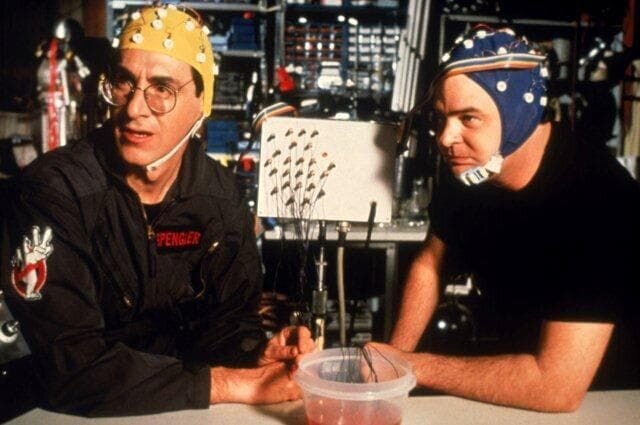 Dr. Spengler (Harold Ramis, l.) und Dr. Stantz (Dan Aykroyd, r.) führen mit dem gefundenen rosa Schleim experimentelle Feldversuche durch: Sie entdecken, dass der Schleim durch schlechte Gedanken genährt wird ...Bild: © ZDF